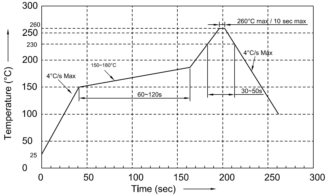 1. Wir empfehlen eine Reflow-Temperatur von 245 ± 5 °C. Die maximale Löttemperatur sollte für maximal 10 Sekunden auf 260 °C begrenzt werden.